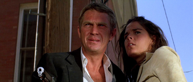 Though its myriad of less-than-enthralling elements are compounded by a seriously overlong running time, The Getaway ultimately comes off as an above-average thriller that’s elevated by the inclusion of several electrifying sequences and an expectedly charismatic turn from Steve McQueen. The storyline follows recently-paroled convict Doc McCoy (McQueen) as he and his girlfriend (Ali MacGraw’s Carol) are forced to go on the run after a bank heist goes awry, with the bulk of the proceedings detailing the couple’s efforts at reaching a safe house near the border while avoiding the murderous advances of a vicious cohort (Al Lettieri’s Rudy Butler). There’s little doubt that The Getaway takes an awfully long time to grow on the viewer, as the movie suffers from an almost egregiously slow opening half hour that’s exacerbated by Peckinpah’s reliance on eye-rollingly ostentatious editing tricks (with Quincy Jones’ grating score certainly not helping matters). The robbery that kicks the story into motion inevitably proves to be the film’s turning point, although – admittedly – the episodic midsection does ensure that some segments are far more enthralling than others (ie Doc must scour a train station after a petty thief makes away with his loot). Peckinpah’s penchant for visceral instances of violence is never more evident than in the movie’s action-packed final showdown, in which Doc is essentially forced to take on a small army’s worth of mob soldiers within a dilapidated hotel. It’s a fantastic sequence that inevitably cements The Getaway‘s place as a crackling thriller trapped within the confines of a bloated disappointment, which is a shame, certainly, given the strength of both McQueen and MacGraw’s work here (ie the revelation that the two actors fell in love on the set is hardly surprising, as the chemistry between their respective characters is palpable).