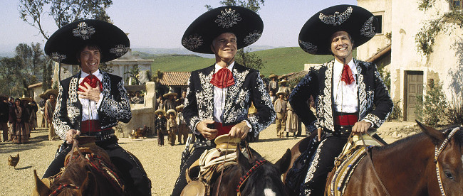 As excessively silly as its premise would indicate, ¡Three Amigos! follows a trio of out-of-work silent movie stars (Steve Martin’s Lucky Day, Martin Short’s Ned Nederlander, and Chevy Chase’s Dusty Bottoms) as they agree to put on a show for a Mexican village without realizing that the danger is very, very real. (Much of the film’s first half details the wackiness that ensues as the protagonists approach perilous situations assuming they’re part of the performance.) Director John Landis, working from a script by Martin, Lorne Michaels, and Randy Newman (!), delivers an entertainingly broad comedy that benefits from the go-for-broke work of its stars, with, in particular, Martin and Short infusing their respective characters with an exuberant idiocy that’s impossible to resist. (Chase doesn’t fare quite as well, unfortunately, as he’s given so little to do that he rarely makes much of an impact.) And while the movie’s narrative rarely strays from the well-established formula, ¡Three Amigos! has been punctuated with a series of laugh-out-loud funny bits that generally compensate for the less-than-fresh atmosphere. It’s clear, as well, that the film suffers from a somewhat hit-and-miss execution that’s compounded by a slightly overlong running time, and it’s generally rather apparent that the movie’s been designed to appeal predominantly to younger viewers. Still, ¡Three Amigos!‘ pervasively affable vibe ensures that its negative aspects are, for the most part, easy enough to overlook – with the movie’s success confirmed by a thoroughly satisfying climactic stretch (which boasts a hilarious bit involving an inspirational speech from Martin’s character).