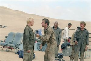 That Flight of the Phoenix contains such a predictable storyline and stereotypical characters comes as something of a surprise, given that the screenplay's been written by Scott Frank (Out of Sight, Minority Report) and actor/director Ed Burns (though he doesn't appear in the film). The film's structure becomes evident fairly quickly - 15-20 minutes of dialogue followed by some sort of an action sequence (ie an electrical storm or an encounter with some nomads) - and the majority of these characters aren't developed beyond their outward appearances. As a result, the film is peppered with stock clichés (such as a quick-tempered Irishman and a sage-like Arab), while the more recognizable faces in the cast are essentially playing off their established personas.
