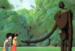 An unexpectedly thrilling adventure from Hayao Miyazaki, Castle in the Sky follows a pair of scrappy adolescents, Pazu and Sheeta, as they're thrust into a rip-roaring escapade involving pirates, secret agents, and, of course, the title locale. Miyazaki, working from his own screenplay, does a fantastic job of immediately grabbing the viewer's interest, as Castle in the Sky opens with an impressively engrossing action sequence set aboard an enormous airship - with the pre-credits set piece setting a fast-paced, Indiana Jones-like tone that proves impossible to resist. (Well, fast-paced by Miyazaki's otherwise excessively, interminably deliberate standards, anyway.) The typically overlong running time isn't, as a result, as problematic as one might've feared, as Miyazaki effectively peppers the proceedings with one exhilarating scene after another - including a fantastic bit involving an oversized robot. (It's worth noting, too, that the movie fares quite well in its smaller, quieter sequences, with the vivid characters, both good and bad, perpetuating the persistently watchable atmosphere.) And although the 124 minute running time begins to wear on the viewer past a certain point, Castle in the Sky's energetic climactic stretch ensures that the film ends on a palpably high note - which confirms the movie's place as a better-than-average effort from Miyazaki. (This is, after all, one of his few works that matches his always-gorgeous visuals with a compelling story and interesting characters.)