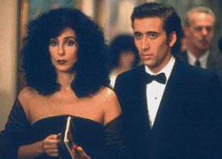 Moonstruck casts Cher as Loretta Castorini, a brassy Italian-American who is engaged to marry a likeable schlub named Johnny Cammareri (Danny Aiello). After Johnny leaves for Italy to inform his mother of the impending wedding, Loretta is left with the task of inviting Johnny's black-sheep brother Ronny (Nicolas Cage) to the ceremony. Problems emerge once Loretta finds herself falling for said brother, despite the objections of her mother (Olympia Dukakis) and sundry family members. Director Norman Jewison - working from a screenplay by John Patrick Shanley - emphasizes the neighborhood within which Loretta lives and singles out several quirky inhabitants, often focusing entirely on their off-kilter exploits (ie Loretta's father's affair with a dim-witted waitress). Such digressions ultimately lend the proceedings a distinct vibe of unevenness, and there's little doubt that the film would've benefited from a more pronounced emphasis on Loretta's budding relationship with Ronny. And although the film is never boring - Cage's strangely over-the-top performance goes a long way towards keeping things interesting - Moonstruck is generally unable to live up to its reputation as a classic romantic comedy.