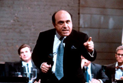 Based on a play by Jerry Sterner, Other People's Money follows corporate raider Lawrence Garfield (Danny DeVito) as he threatens a hostile takeover of a successful yet failing business run by Gregory Peck's Andrew Jorgenson - with Lawrence eventually receiving opposition in the form of a crafty lawyer named Kate Sullivan (Penelope Ann Miller). Filmmaker Norman Jewison admittedly does an effective job of initially luring the viewer into the unapologetically stagy proceedings, as Other People's Money boasts an entertaining and briskly-paced opening stretch that's heightened considerably by DeVito's commanding and charming performance - with the actor certainly receiving plenty of more-than-capable support from a fairly stacked supporting cast. It does become increasingly clear, though, that there's little here designed to wholeheartedly sustain one's ongoing interest, as scripter Alvin Sargent bogs the thin narrative down with less-than-fascinating financial minutia and a continuing emphasis on the flirtatious relationship between DeVito and Miller's respective characters - with the latter proving especially disastrous given the actors' complete and total lack of chemistry together. And although the picture, at least, concludes with a stirring climax featuring impassioned speeches from both Andrew and Lawrence, Other People's Money predominantly comes off as an ill-advised adaptation that just doesn't have enough material or substance to sustain a feature-length running time.
